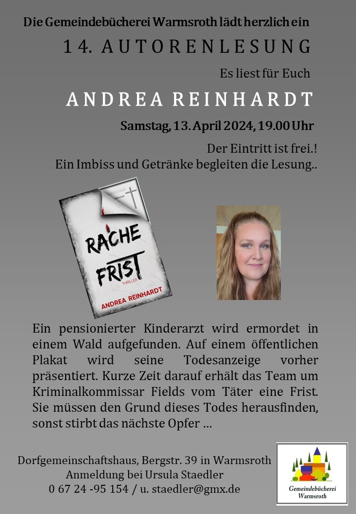 Am Samstag, den 13.04.2024 fand um 19:00 Uhr im Dorfgemeinschaftshaus eine Autorenlesung mit Andrea Reinhardt statt. Nähere Informationen entnehmen Sie bitte der Einladung. - 10.04.2024