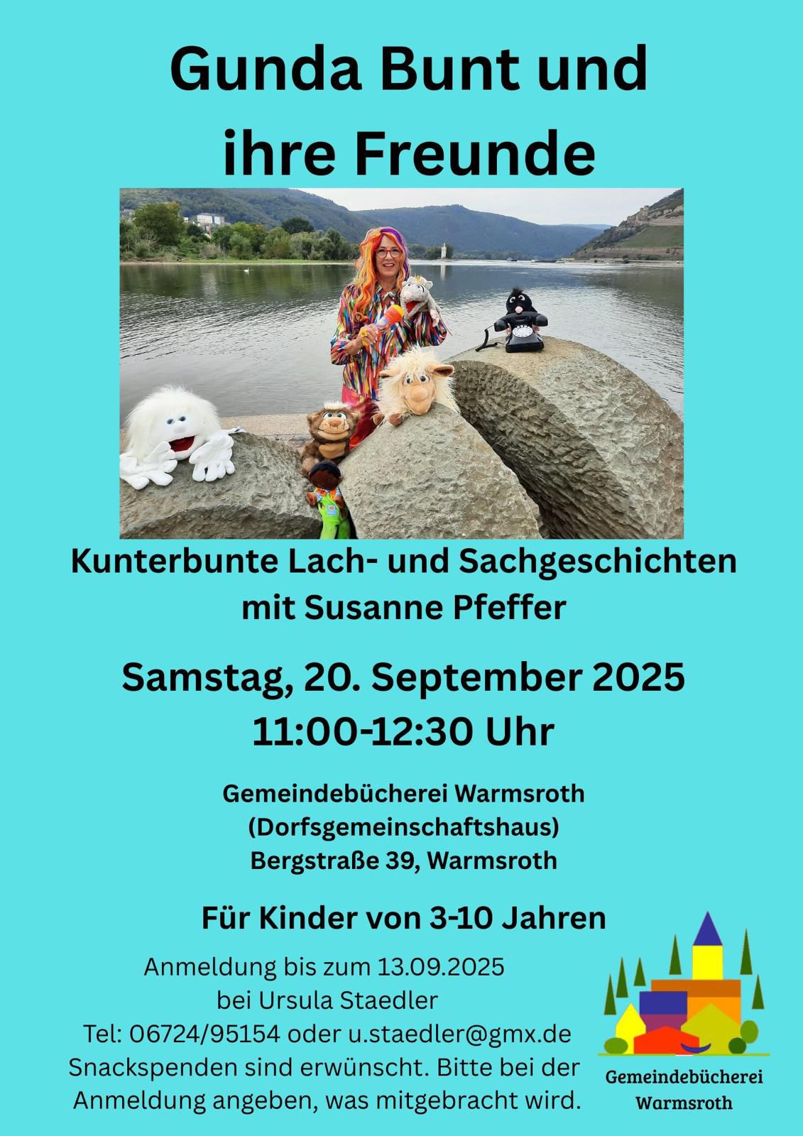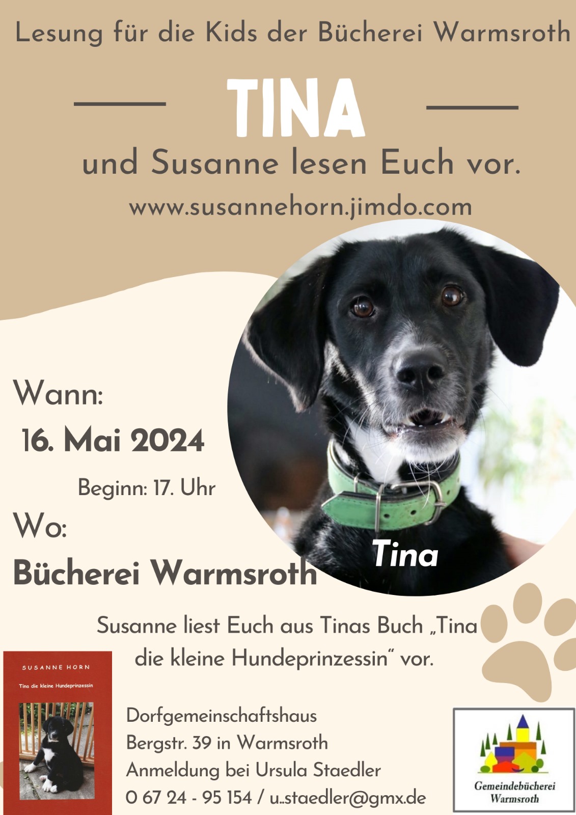 Am Donnerstag, den 16.05.2024 fand um 17:00 Uhr in der Bücherei im Dorfgemeinschaftshaus eine Lesung für Kinder mit Susanne Horn und Tina statt. Nähere Informationen entnehmen Sie bitte der Einladung. - 13.04.2024