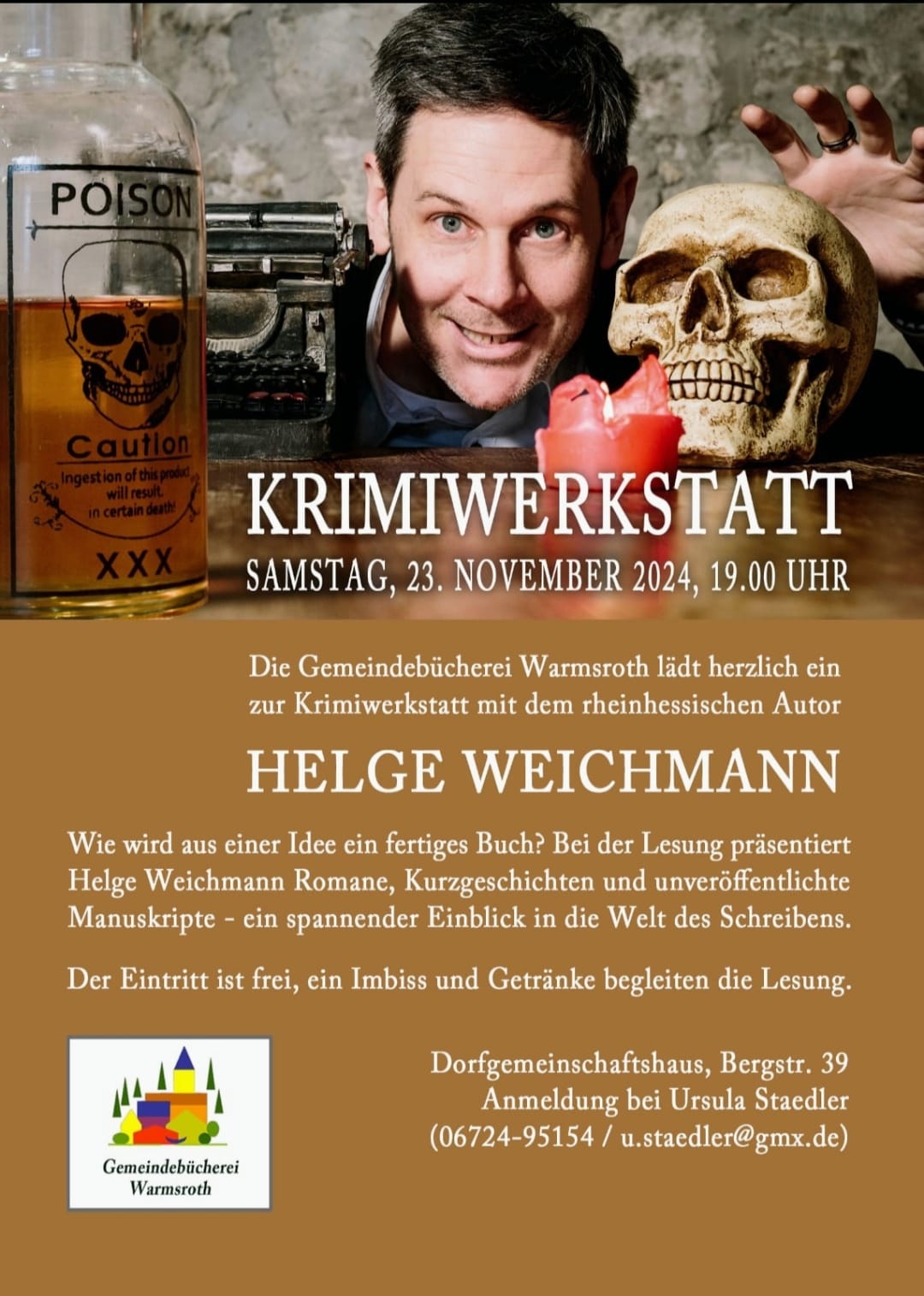 Am Samstag, den 28.02.2026 findet um 19:00 Uhr im Dorfgemeinschaftshaus eine Autorenlesung mit Helge Weichmann statt. Informationen über das Ereignis entnehmen Sie bitte dem Flyer.