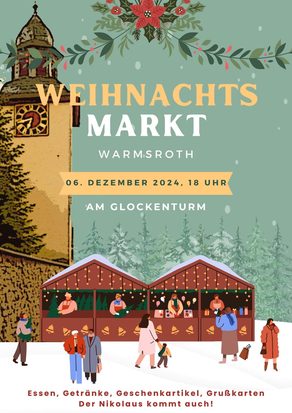 Am Freitag, den 06.12.2024, fand der diesjährige Weihnachtsmarkt am Glockenturm statt. Ab 18:00 Uhr traf man sich am Glockenturm; für die Kinder brachte der Nikolaus eine kleine Überraschung Infoblatt zum Weihnachtsmarkt 2024 - 23.11.2024