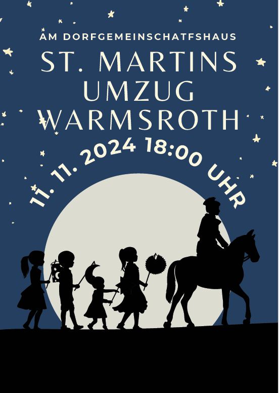Am Montag, den 11.11.2024 fand der traditionelle Umzug zu St. Martin statt. Die Teilnehmer trafen sich um 18.00 Uhr am Dorfgemeinschaftshaus; nach dem Umzug durchs Dorf ging es zum Martinsfeuer, und anschließend konnten die Kinder im Dorfgemeinschaftshaus einen Weckmann abholen. (Information St. Martin 2024) - 18.-21.10.2024