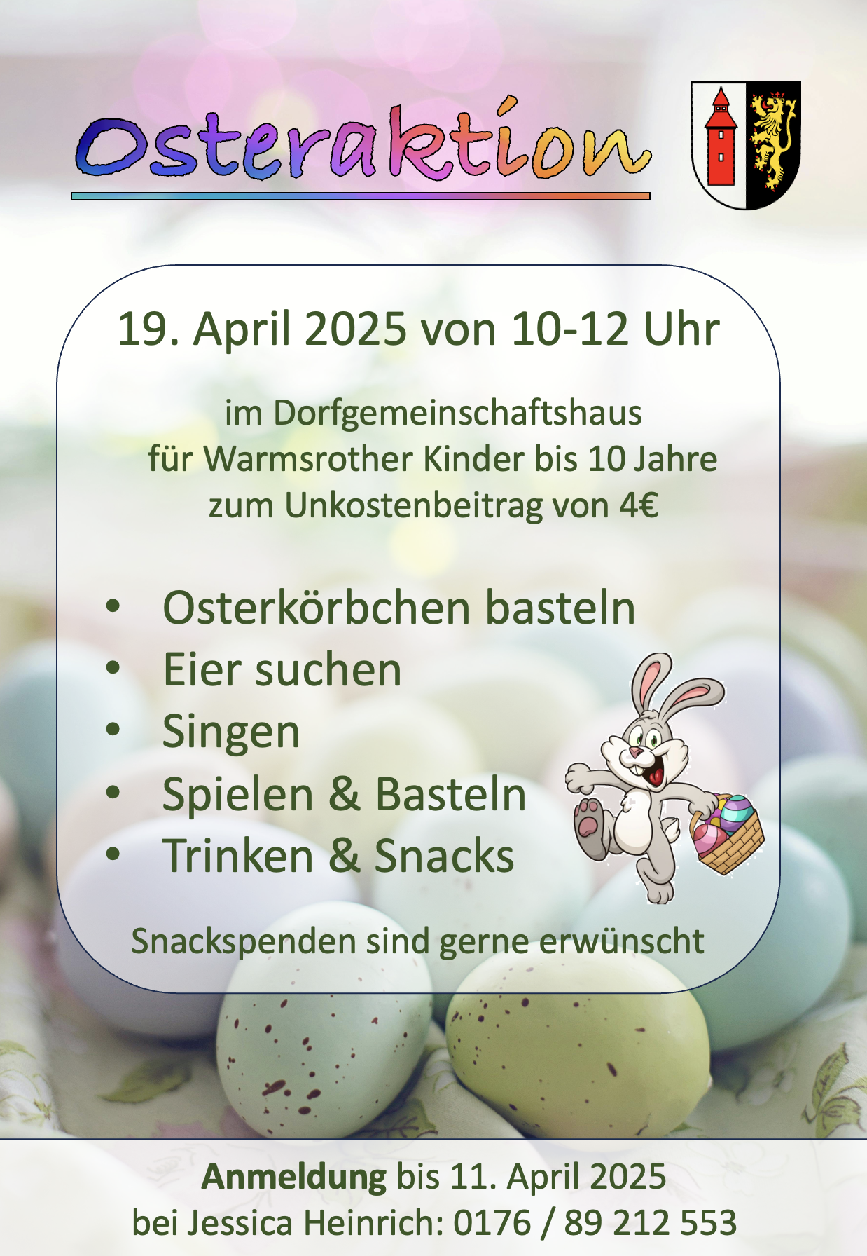 Am Samstag, den 19.04.2025 fand zwischen 10 - 12 Uhr im Dorfgemeinschaftshaus eine Osteraktion für Kinder statt. Nähere Informationen entnehmen Sie bitte der Einladung. - 25.03.2025