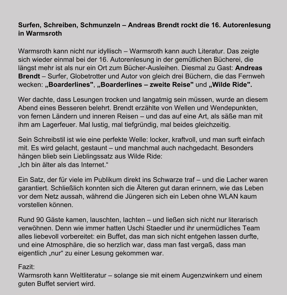 Am Samstag, den 17.05.2025 fand um 19:00 Uhr im Dorfgemeinschaftshaus eine Autorenlesung mit Andreas Brendt statt. Nähere Informationen entnehmen Sie bitte dem Bericht. - 06.05.2025