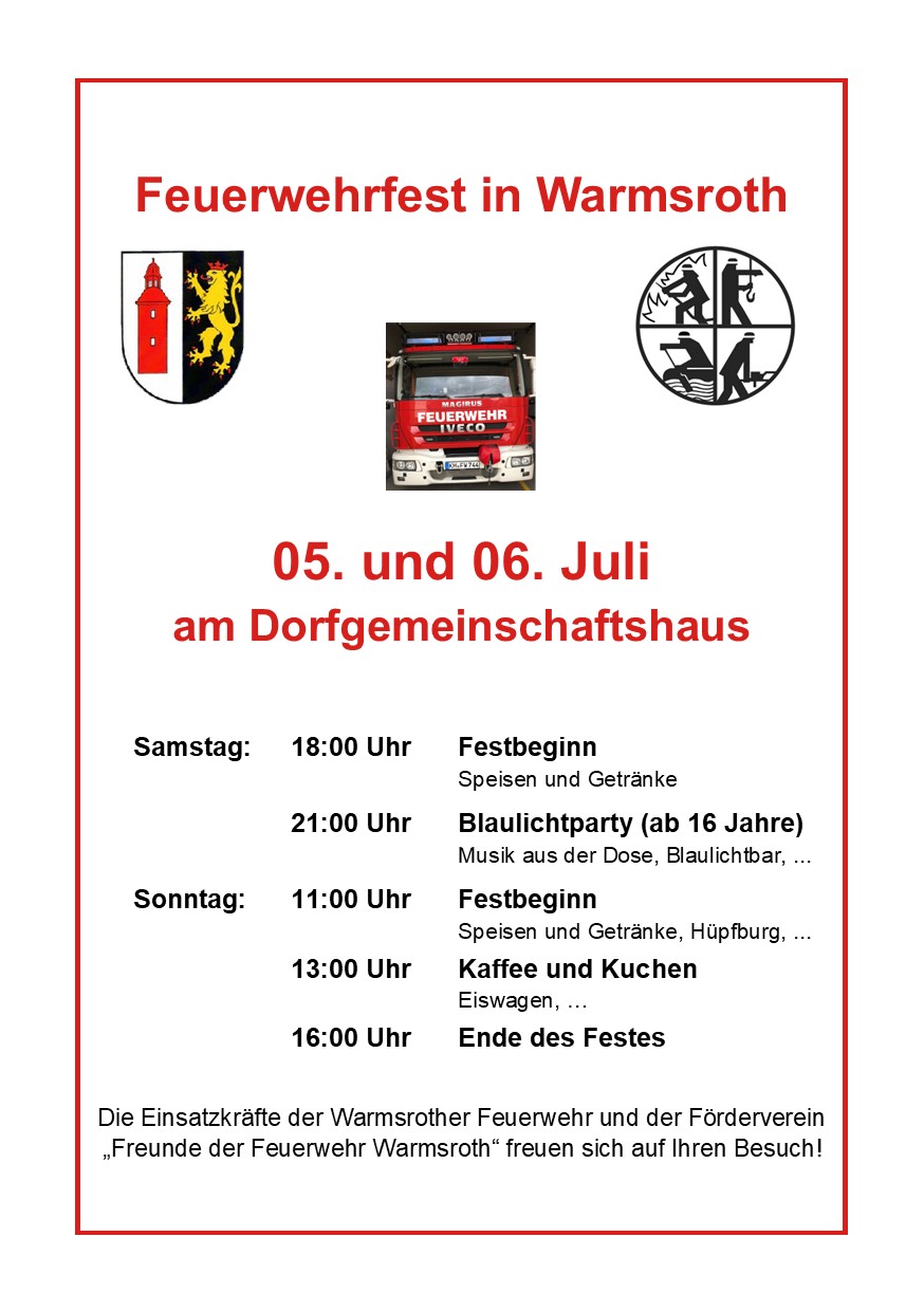 Am Wochenende vom 05.-06.07.2025 veranstaltete der Förderverein "Freunde der Feuerwehr Warmsroth" das Feuerwehrfest 2025 am Dorfgemeinschaftshaus. (Einladung & Information) - 17.06.2025
