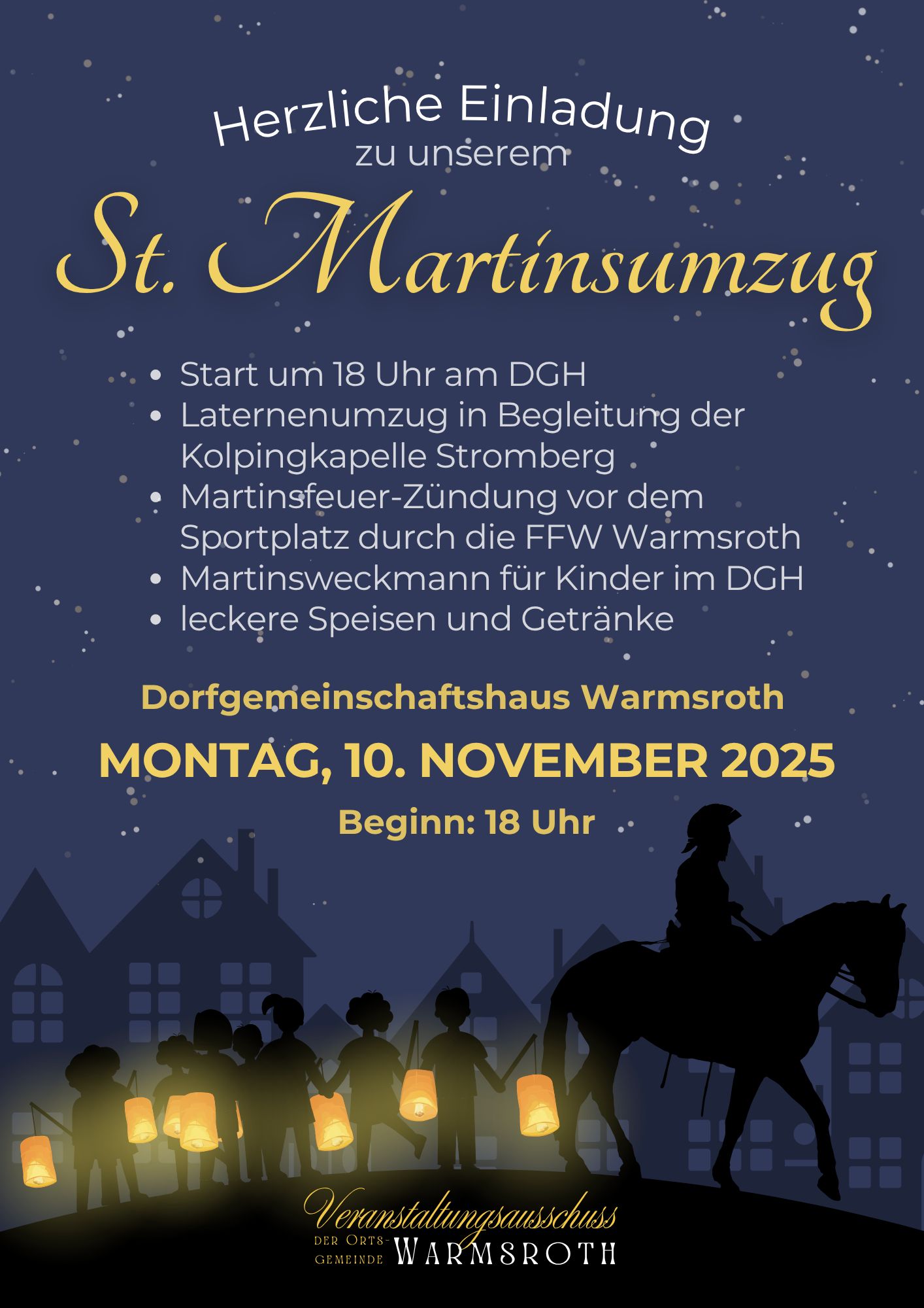 Am Montag, den 10.11.2025 fand der traditionelle Umzug zu St. Martin statt. Die Teilnehmer trafen sich um 18.00 Uhr am Dorfgemeinschaftshaus; nach dem Umzug durchs Dorf ging es zum Martinsfeuer, und anschließend konnten die Kinder im Dorfgemeinschaftshaus einen Weckmann abholen. (Information St. Martin 2025) - 08.11.2025