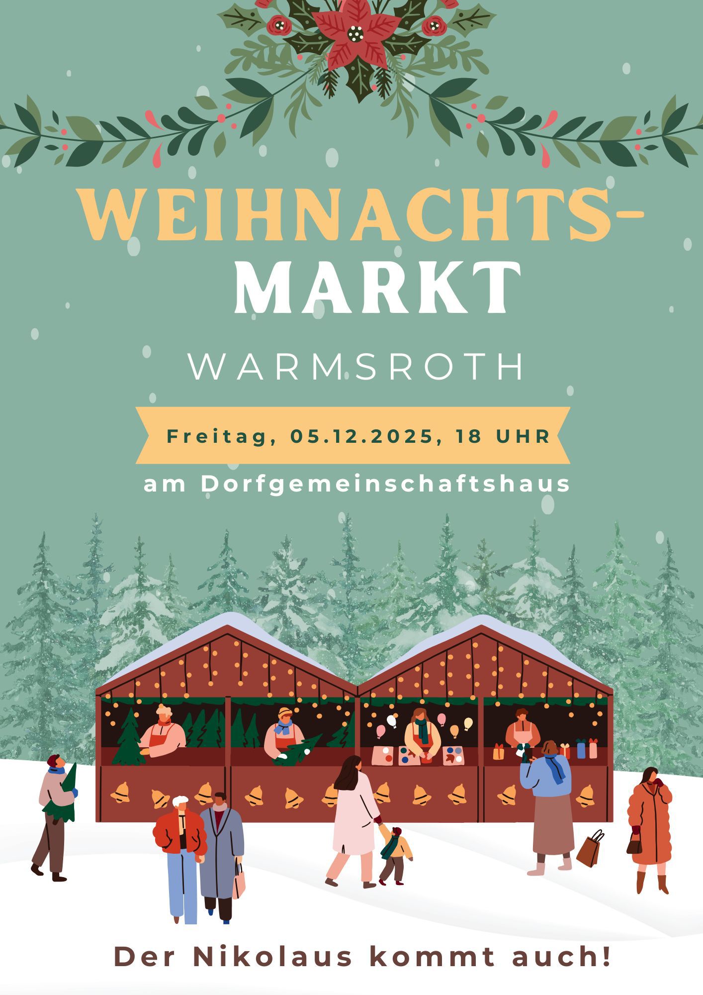 Am Freitag, den 05.12.2025, findet der diesjährige Weihnachtsmarkt am Dorfgemeinschaftshaus statt. Ab 18:00 Uhr trifft man sich; für die Kinder bringt der Nikolaus eine kleine Überraschung Infoblatt zum Weihnachtsmarkt 2025 - 28.02.2026