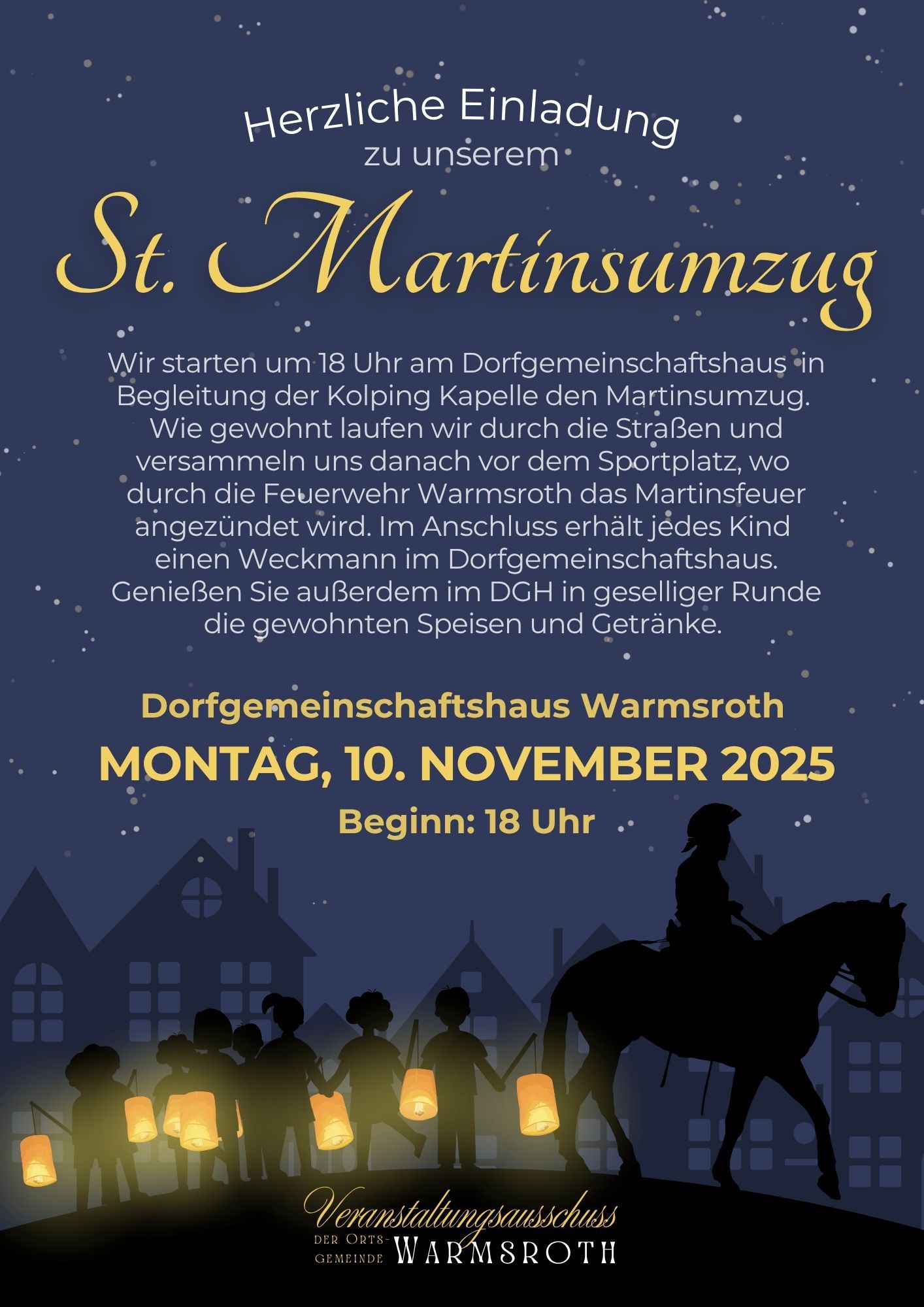 Am Montag, den 10.11.2025 findet der traditionelle Umzug zu St. Martin statt. Die Teilnehmer trafen sich um 18.00 Uhr am Dorfgemeinschaftshaus; nach dem Umzug durchs Dorf ging es zum Martinsfeuer, und anschließend konnten die Kinder im Dorfgemeinschaftshaus einen Weckmann abholen. (Information St. Martin 2025) - 29.11.2025